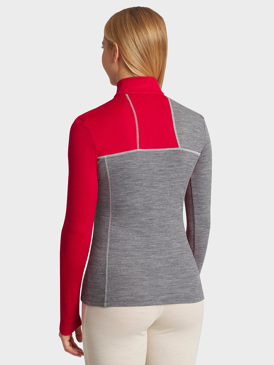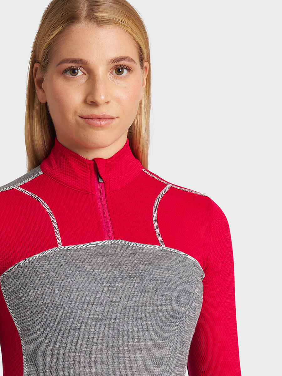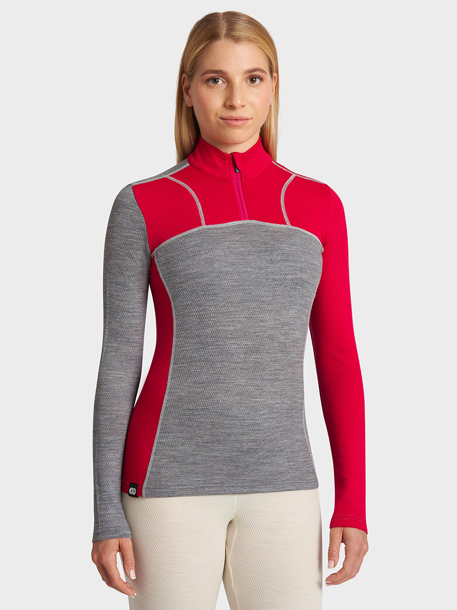 Women's long-sleeved sweatshirt with high neck with zip closure in soft 180 gr / m² Merino Mesh. Ideal as a base layer for outdoor sports such as snow sports, trekking and mountaineering.