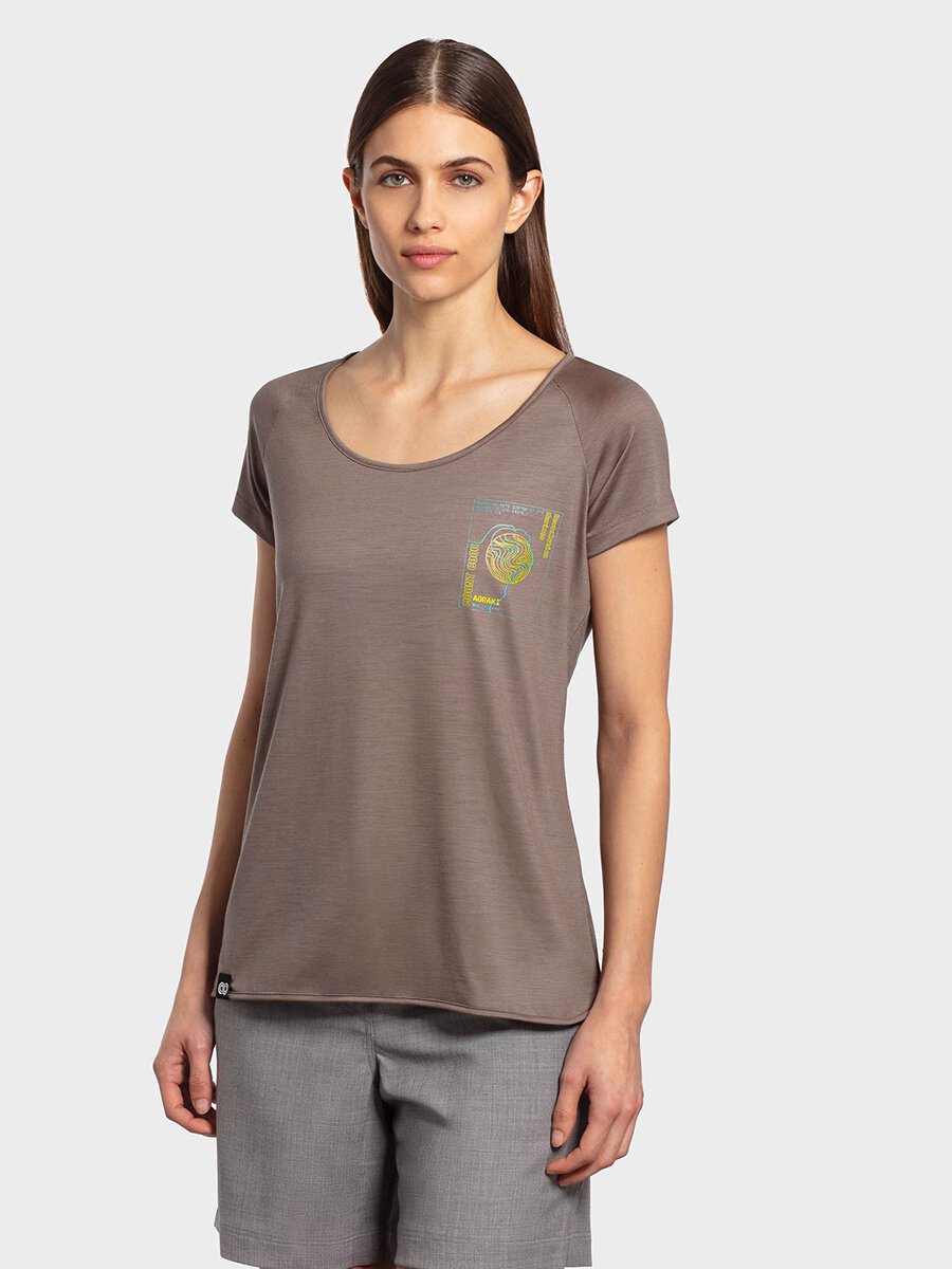 T-shirt a scollo profondo con stampa frontale a manica corta da donna. Particolarmente leggera e morbida, asciuga rapidamente e grazie alla sua vestibilità comoda è ideale sia per attività sportive all'aperto che per il tempo libero.