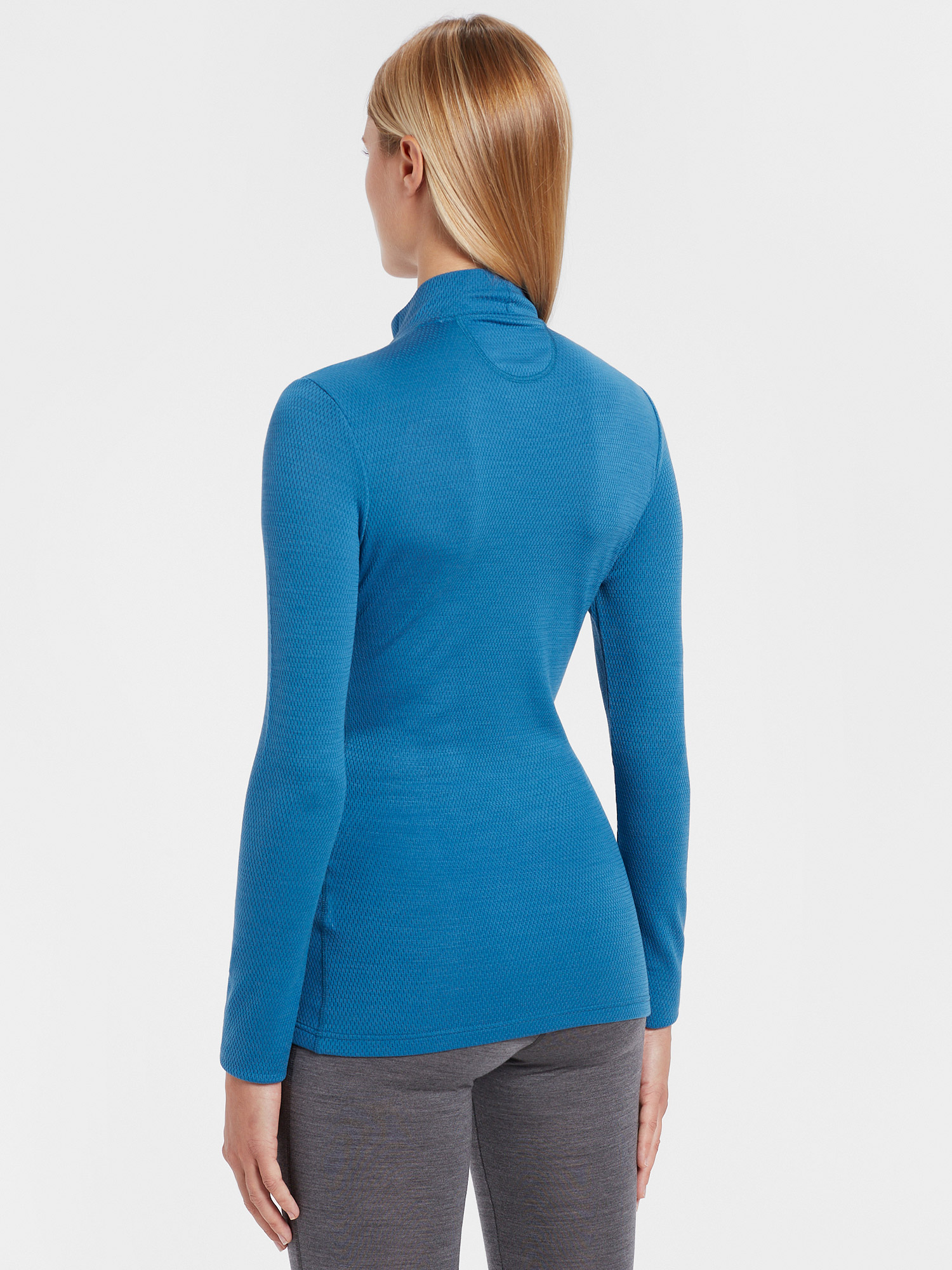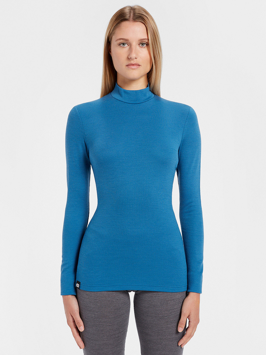 Langarm Damen Funktionsshirt mit hohem Kragen aus weichem Merino Mesh 180 gr/m2. Elastisch, weich und atmungsaktiv, es ist ideal als Basisschicht für Sports im Freien.