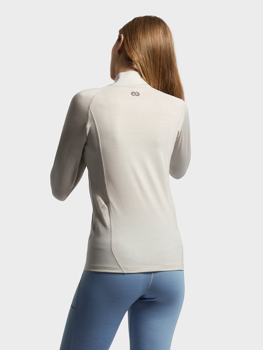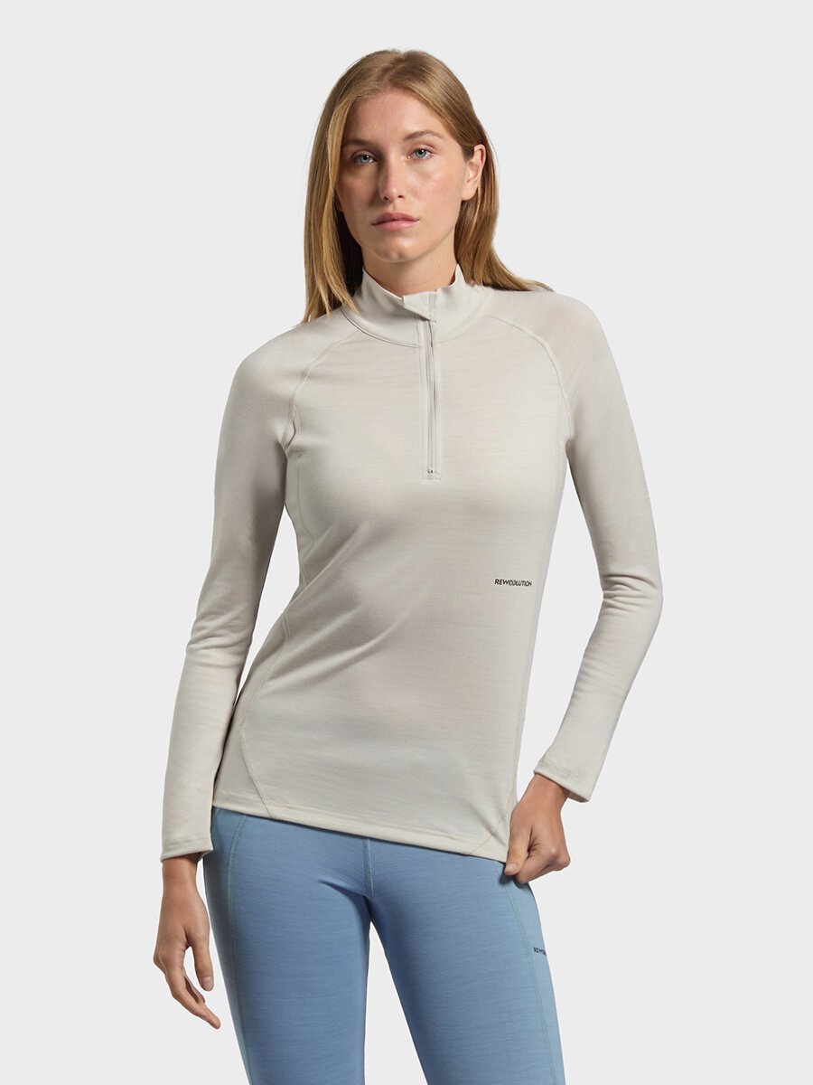• Felpa base layer da donna a manica lunga con collo alto e chiusura half zip in Merino Jersey da 190 gr / m². Ideale come strato base per attività sportive outdoor come sport da neve, trekking e alpinismo
